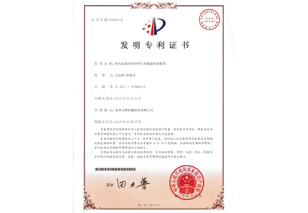 Invention certificate of performance test device for sealing gasket used in nuclear power equipment